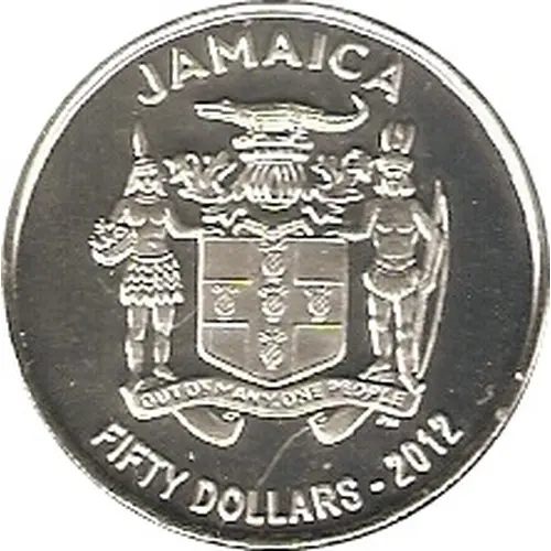 | Chữ khắc mặt trước | JAMAICA FIFTY DOLLARS - 2012 OUT OF MANY, ONE PEOPLE |