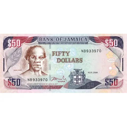 Leyenda del anverso BANK OF JAMAICA FIFTY DOLLARS SAMUEL SHARPE GOVERNOR ISSUED UNDER THE BANK OF JAMAICA ACT