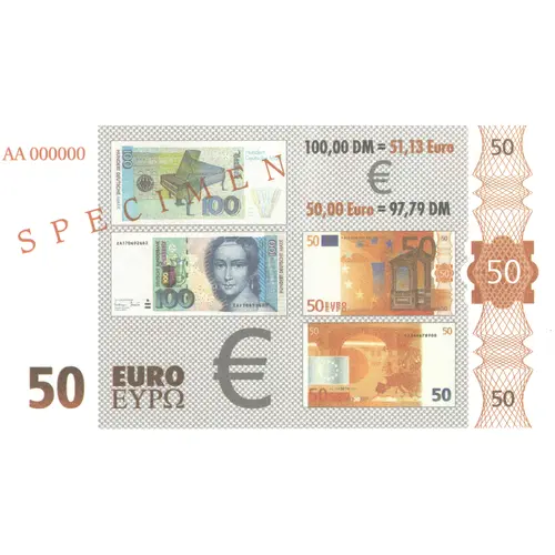 SPECIMEN AA000000 100,00 DM = 51,13 Euro € 50,00 Euro = 97,79 DM 50 EURO EYPΩ € |