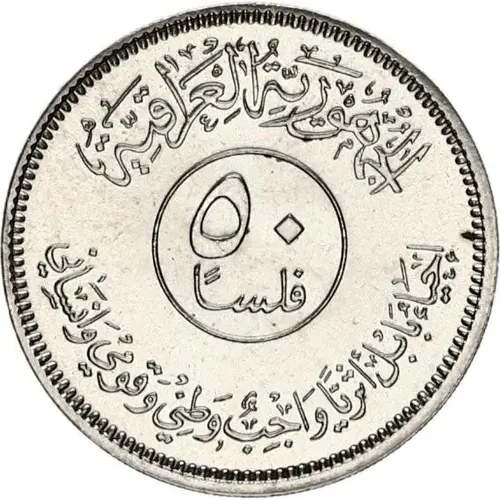 | Chữ khắc mặt trước | الجمهورية العراقية ٥٠ فلساً أحياء بابل أثريا واجب وطني و قومي و انساني (Translation: Republic of Iraq 50 Fils The restoration of Babel, a public and national responsibility) |