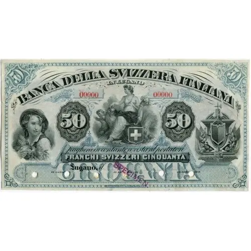 | Légende de l’avers | 50 50 BANCA DELLA SVIZZERA ITALIANA IN LUGANO CINQUANTA CINQUANTA 50 50 FRANCHI SVIZZERI CINQUANTA Lugano, il IL CASSIERE IL PRESIDENTE IL DIRETTORE American Bank Note Co New York |