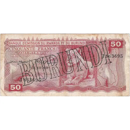 | نوشتههای پشت اسکناس | BANQUE D`EMISSION DU RWANDA ET DU BURUNDI 50 (Translation: Issuing bank of Rwanda and Burundi.) |