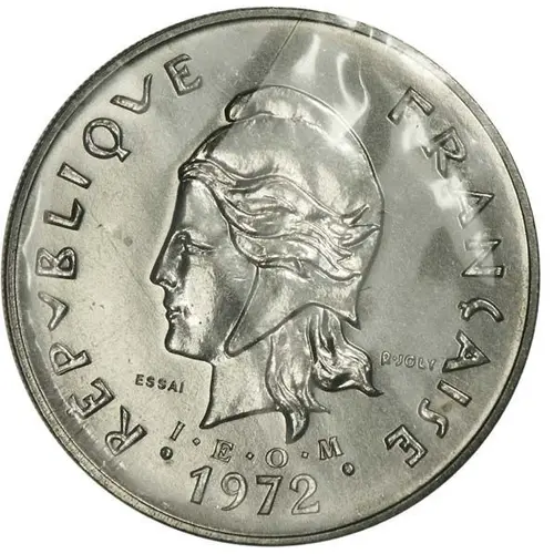 | Legenda awersu | RÉPVBLIQVE FRANÇAISE R·JOLY I·E·O·M ESSAI 1972 (Translation: French Republic) |
