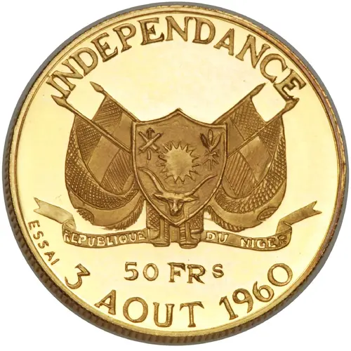 | Opis líce | INDEPENDANCE REPUBLIQUE DU NIGER 50 FR ESSAI 3 AOUT 1960 (Translation: Independence. Republic of Niger. Trial. August 3rd, 1960.) |