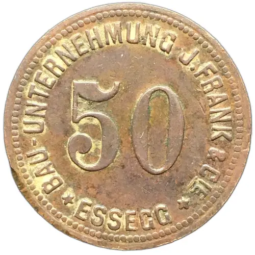 | نوشتههای روی توکن | BAU-UNTERNEHMUNG J.FRANK & CiE 50 ESSEGG (Translation: Construction company J. Frank & Co. Osijek) |
