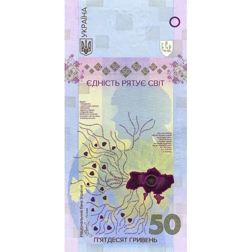 | Obverse lettering | УКРАЇНА ЄДНІСТЬ РЯТУЄ СВІТ ЄДНІСТЬ І СОЛІДАРНІСТЬ З УКРАЇНСЬКИМ НАРОДОМ НАБЛИЖАЮТЬ ПЕРЕМОГУ УКРАЇНИ В БОРОТЬБІ ПРОТИ РОСІЙСЬКОГО АГРЕСОРА ТА РЯТУЮТЬ СВІТ ВІД ХАОСУ ТА МОРОКУ НАСИЛЛЯ UNITY AND SOLIDARITY WITH THE UKRAINIAN PEOPLE ARE BRINGING CLOSER UKRAINE’S VICTORY IN THE FIGHT AGAINST THE RUSSIAN AGGRESSOR, AND ARE SAVING THE WORLD FROM THE CHAOS AND DARKNESS OF VIOLENCE ВІЙСЬКОВА ДОПОМОГА УКРАЇНІ MILITARY ASSISTANCE ПОЛІТИЧНА ПІДТРИМКА УКРАЇНИ POLITICAL SUPPORT FOR UKRAINE ФІНАНСОВА ДОПОМОГА УКРАЇНІ FINANCIAL ASSISTANCE ГУМАНІТАРНА ДОПОМОГА HUMANITARIAN AID ДОПОМОГА ЕНЕРГЕТИЧНОМУ СЕКТОРУ SUPPORT FOR UKRAINE`S ENERGY SECTOR НАЦІОНАЛЬНИЙ БАНК УКРАЇНИ Голова П’ЯТДЕСЯТ ГРИВЕНЬ 50 (Translation: UKRAINE UNITY SAVES THE WORLD UNITY AND SOLIDARITY WITH THE UKRAINIAN PEOPLE ARE BRINGING CLOSER UKRAINE`S VICTORY IN THE FIGHT AGAINST THE RUSSIAN AGGRESSOR, AND ARE SAVING THE WORLD FROM THE CHAOS AND DARKNESS OF VIOLENCE MILITARY ASSISTANCE TO UKRAINE POLITICAL SUPPORT FOR UKRAINE FINANCIAL ASSISTANCE TO UKRAINE FINANCIAL ASSISTANCE HUMANITARIAN AID SUPPORT FOR UKRAINE`S ENERGY SECTOR NATIONAL BANK OF UKRAINE Chairman FIFTY HRYVNIAS 50) |