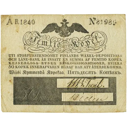| Obverse lettering | Femtio Kopek Uti Storfurstemdömet Finlands wäxel-depositions och låne-bank är insatt en summa av femtio kopeck kejserliga ryska banko-assignationer, hvilka 50 kopek innehafveren häraf har att återbekomma. Wiisi Kymmentä kopekaa (Translation: Fifty Kopeks In the Grand Principality of Finland`s Exchange-Deposit and Loan Bank are held the sum of fifty kopecks Imperial Russian Bank Assignats, of which the holder has 50 kopeck to receive. Fifty Kopeks Fifty Kopeks) |