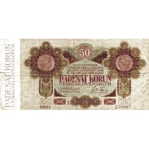 | 正面铭文 | PADESÁT KORUN ČESKOSLOVENSKÝCH 50 TATO STÁTOVKA VYDANÁ PODLE ZÁKONA ZE DNE 10. DUBNA 1919 Č. 187. SB, Z.A NAŘ, PLATÍ PADESÁT KORUN ČESKOSLOVENSKÝCH V PRAZE, DNE 15.DUBNA 1919 MINISTR FINANCÍ PADĚLÁNÍ STÁTOVEK TRESTÁ SE PODLE ZÁKONA SERIE ČÍSLO (Translation: Fifty Czechoslovak crowns 50 This statement issued under the Act of April 10, 1919 No. 187. Collections of laws and regulations applicable Fifty Czechoslovak crowns In Prague, on April 15, 1919 Minister of Finance Forgery of statements is punished by law) |