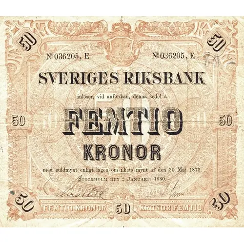 | Chữ khắc mặt trước | Sveriges Riksbank inlöser, vid anfordran, denna sedel å Femtio Kronor med guldmynt enligt lagen om rikets mynt af den 30 Mai 1873 (Translation: Sweden`s Riksbank will pay, on demand, for this note Fifty Kronor in gold coin according to the law on the national coinage of 30th May 1873) |