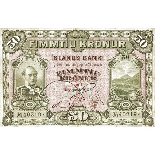 | Obverse lettering | Íslands banki greiðir handhafa gegn seðli þessum Fimmtíu krónur i gulli. Reykjavík 1904. (Translation: The Bank of Iceland will pay the bearer against this banknote fifty Krónur in gold. Reykavik, 1904.) |