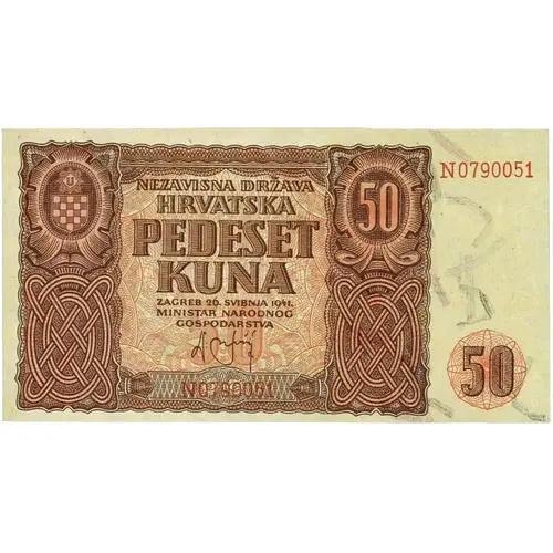 | Obverse lettering | Nezavisna Država Hrvatska 50 Kuna Zagreb, 30. Kolovoza 1941 Ministar narodnog gospodarstva (Translation: Independent State of Croatia 50 Kuna Zagreb, 30. May 1941 Minister of National Economy) |