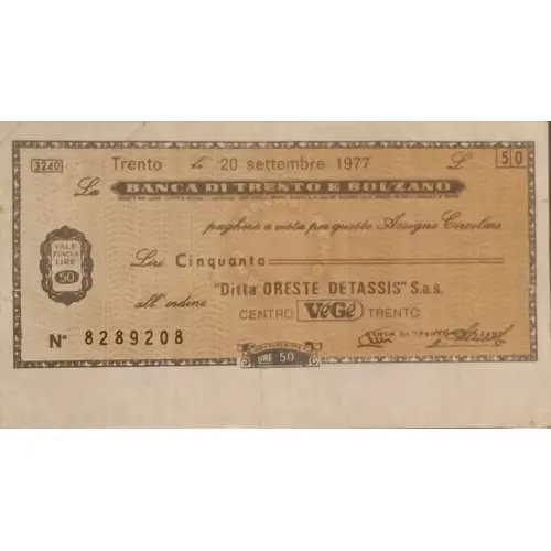 | Opschrift keerzijde | Banca Di Trento E Bolzano Società Per Azioni - Capitale Sociale L. 1.000.000.000 - Sede Sociale Trento - Iscritta Al N. 3935 Del Registro Delle Imprese Presso Il Tribunale Di Trento VALE 50 LIRE IL PRESENTE ASSEGNO PUÒ CIRCOLARE SOLTANTO IN ITALIA (Translation: Bank of Trento and Bolzano Joint Stock Company - Share Capital and Reserves: 1,000,000,000 Lire - Registered Office in Trento - Enrolled Number 3935 in the Business Register at the Court of Trento Worth 50 Lire This check may be circulated only in Italy) |
