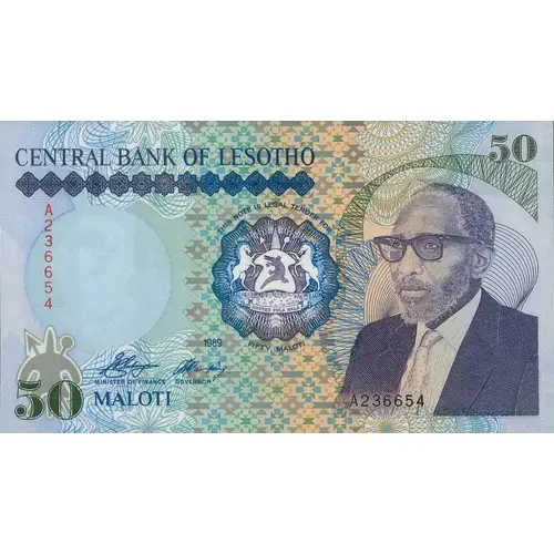 Obverse lettering CENTRAL BANK OF LESOTHO THIS NOTE IS LEGAL TENDER FOR FIFTY MALOTI 50 MALOTI