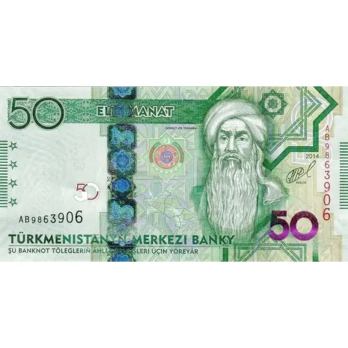 | نوشتههای روی اسکناس | ELLI MANAT TÜRKMENISTANYŇ MERKEZI BANKY ŞU BANKNOT TÖLEGLERIŇ ÄHLI GÖRNÜŞLERI ÜÇIN ÝÖREÝÄR (Translation: Fifty Manat, Central Bank of Turkmenistan, This banknote is valid for all types of payments) |