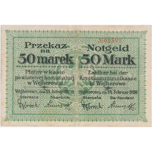 Przekaz na 50 Marek Płatny w kasie powiatowej komunalnej w Wejherowie Wejherowo, dnia 14 lutego 1920r Starosta Skarbnik |