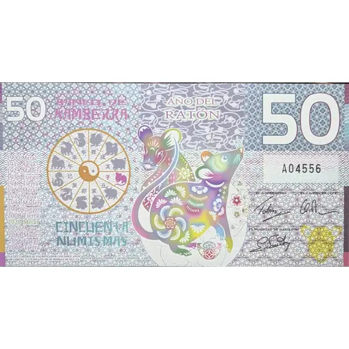 | Legenda del dritto | 50 BANCO DE KAMBERRA AÑO DEL RATON CINCUENTA NUMISMAS LA LEY CASTIGA AL FALSIFICADOR CON DOCE AÑOS DE CARCEL Y UN MILLION DE NUMISMAS DE MULTA. FRANCK MEDINA DISEÑO Y ARTES GRAFICAS © 2019 |