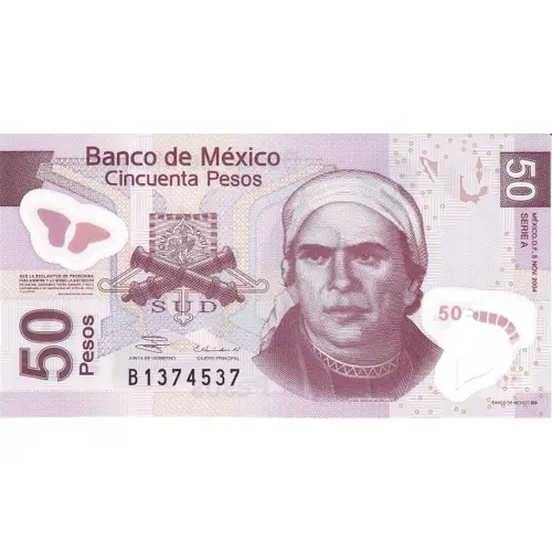 | نوشتههای روی اسکناس | Banco de Mexico Cincuenta Pesos Que la esclavitud se proscriba para siempre, y lo mismo la distinción de castas, quedando todos iguales y sólo distinguirá á un americano de otro, él vicio y la virtúd Sentimientos de la Nación (Translation: Bank of Mexico Fifty Pesos Let slavery be abolished forever along with class distinctions, all remaining equal, with only vice and virtue distinguishing one American from another. Sentiments of the Nation) |