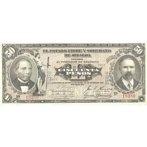 EL ESTADO LIBRE Y SOBERANO DE SINALOA PAGARÁ EL PORTADOR EN EFECTIVO CINCUENTA PESOS CONFORME AL DECRETO FECHA 22 DE FEBRERO 1914 SAN BLAS, SIN. (Translation: The Free and Sovereign State of Sinaloa will pay the bearer in cash Fifty Pesos conforming to the decree dated 22 February 1914. San Blas, Sinaloa) |