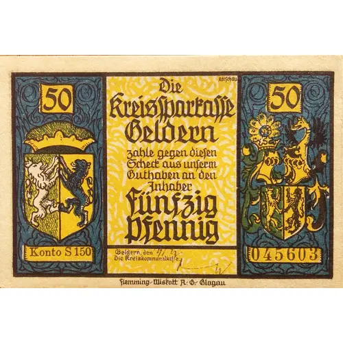 Obverse lettering 50 50 Die KreisSparkasse Geldern zahle gegen diesen Scheck aus unserm Guthaben an der Inhaber fünfzig pfennig Konto S150 045603 Geldern, den Die kreiskommunalkasse Flemming-Wiskott A.G. Glogau