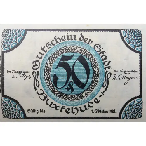 | Legenda do anverso | Gutschein der Stadt 50 p Buxtehude Der Magistrat: Die Bürgermeister: Gültig bis 1.Oktober 1921 DRÜCK: GEBRÜDER JANECKE, HANNOVER |