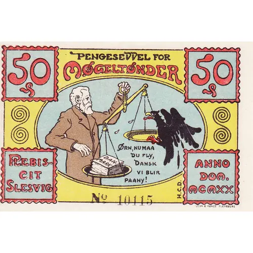 Vorderseitenlegende 50 Pengeseddel for 50 Møgeltønder ØRN, NU MAA DU FLY, DANSK VI BLIR PAANY PLEBISCIT SLESVIG ANNO DOM. MCMXX