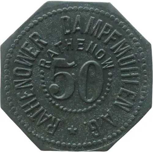 | Legenda awersu | RATHENOWER DAMPFMÜHLEN A.G. RATHENOW 50 |