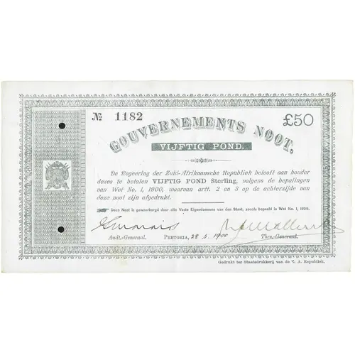 | Надписи лицевой стороны | № 1182 £50 GOUVERNMENTS NOOT. VIJFTIG POND. De Regeering der Zuid-Afrikaansche Republiek belooft aan houder dezes te betalen VIJFTIG POND Sterling, volgens de bepalingen van Wet 1, 1900, waarin artt. 2 en 3 op de achterzijde van deze noot zijn afgedrukt. Deze Noot is gewaarborgd door alle Vaste Eigendommen van den Staat, zooals bepaald in Wet No.1, 1900. Audt.-Generaal. Pretoria, 28.05.1900. Thes.-Generaal Gedrukt ter Staatsdrukkerij van de Z.A Republiek (Translation: № 1182 £50 GOVERNMENTAL NOTE. FIFTY POUNDS. The Government of the South African Republic promises to the holder hereto payable FIFTY POUNDS Sterling, according to the terms of Act 1, 1900, in which artt. 2 and 3 on the back of this note has been printed. This Note is guaranteed by all the Fixed Properties of the State, as provided for in Act No.1, 1900. Auditor-General. Pretoria, 28.05.1900. Thes.-General Printed at the State Printing House of the SA Republic) |