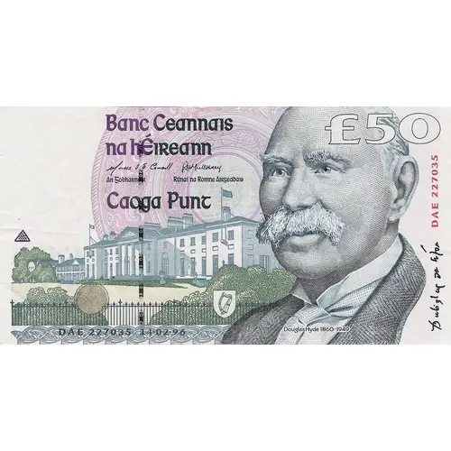 | 正面铭文 | Banc Ceannais na hÉireann Caoga Punt (Translation: Central Bank of Ireland Fifty Pounds) |
