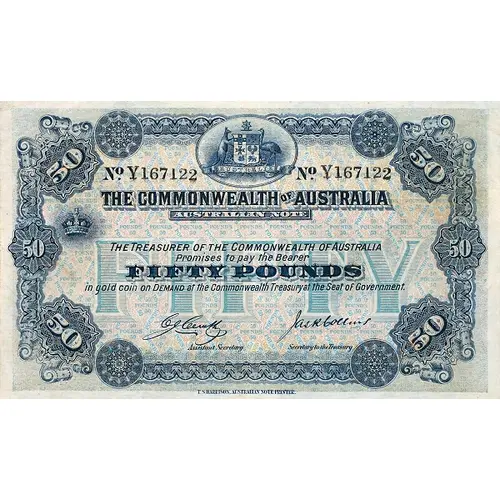 50 50 THE COMMONWEALTH OF AUSTRALIA AUSTRALIAN NOTE THE TREASURER OF THE COMMONWEALTH OF AUSTRALIA Promises to pay the Bearer FIFTY POUNDS in gold coin on DEMAND at the Commonwealth Treasury at the Seat of Government. FIFTY 50 50 |