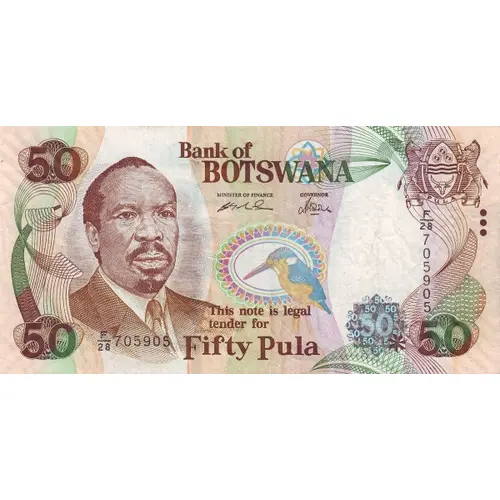 | Chữ khắc mặt trước | Bank of Botswana this note is legal tender for Fifty Pula |