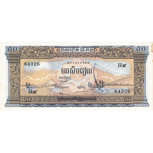 | Reverse lettering | BANQUE NATIONALE DU CAMBODGE CINQUANTE RIELS (Translation: National bank of Cambodia Fifty riels) |