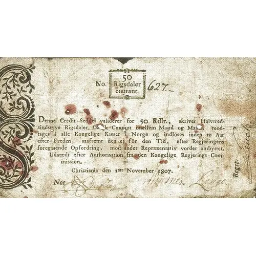 No. 627 50 Rigsdaler Courant Denne Credit - Seddel validere for 50 Rdlr., skriver Halvtred- sindstyve Rigsdaler Dansk Courant imellem Mand og Mand, mod- tages i alle Kongelige Kasser i Norge og indløses inden to Aar efter Freden, saafremt den ej för den Tid, efter Regjeringens foregaaende Opfordring, mod andet Repræsentativ vorder ombyttet. Udstædt efter Authorisation fra den Kongelige Regjerings - Com- mission. Christiania den 1ste November 1807 |