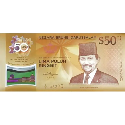 | Obverse lettering | NEGARA BRUNEI DARUSSALAM WANG KERTAS INI SAH DIPERLAKUKAN DENGAN NILAI LIMA PULUH RINGGIT SULTAN 50 YEARS CURRENCY INTERCHANGEABILITY AGREEMENT BRUNEI DARUSSALAM SINGAPORE SULTAN HAJI HASSANAL HOLKIAH |