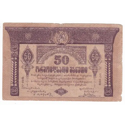 | Legenda del dritto | საქართველოს რესპუბლიკისგული 50 ორმოცდაათი მანეთი მიღება სავალდებულოა თანაბრად რუსეთის სახელმწიფო საკრედიტო ბილეთისა. ბონისათვის პასუხის მგებელია საქართველოს რესპუბლიკა მთელი თავისი ქონებით. 1919 (Translation: Republic of Georgia, Fifty Maneti, Admission is required equally to a Russian state credit currency. The Republic of Georgia with all its property is responsible for this bond.) |