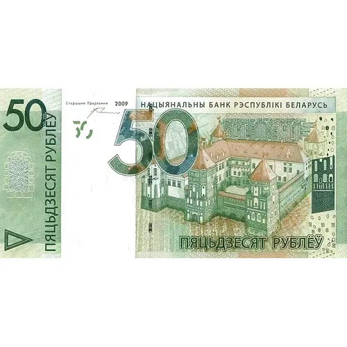 | 表面の銘文 | ПЯЦЬДЗЕСЯТ РУБЛЁЎ 50 2009 НАЦЫЯНАЛЬНЫ БАНК РЭСПУБЛІКІ БЕЛАРУСЬ ПЯЦЬДЗЕСЯТ РУБЛЁЎ (Translation: Fifty Rubles, National Bank of the Republic of Belarus) |