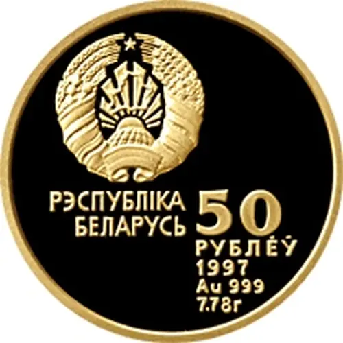 | Надписи аверса | РЭСПУБЛIКА БЕЛАРУСЬ 50 РУБЛЁЎ 1997 Au 999 7.78г (Translation: РЭСПУБЛIКА БЕЛАРУСЬ 50 РУБЛЁЎ 1997 Au 999 7.78г) |
