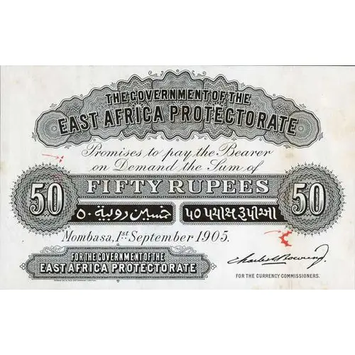 | Legenda awersu | THE GOVERNMENT OF THE EAST AFRICA PROTECTORATE PROMISES TO PAY THE BEARER ON DEMAND THE SUM OF FIFTY RUPEES FOR THE GOVERNMENT OF THE EAST AFRICA PROTECTORATE |