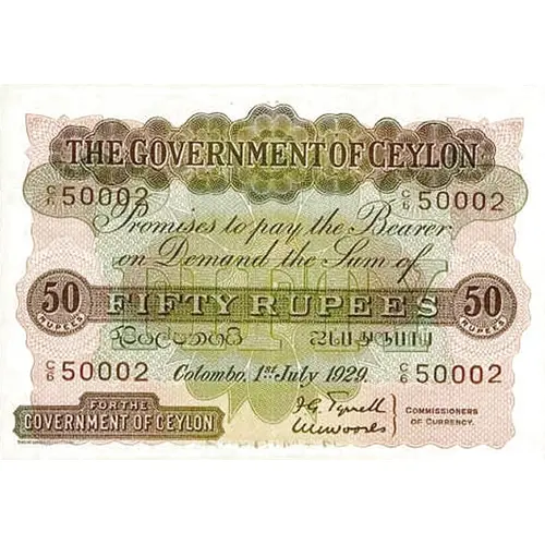 | Ön yüz lejandı | THE GOVERNMENT OF CEYLON Promises to pay the Bearer on Demand the Sum of FIFTY RUPEES Colombo, 1st. July 1929. FOR THE GOVERNMENT OF CEYLON |