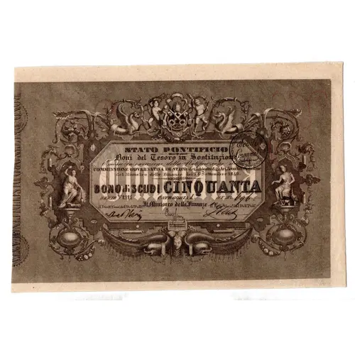 | Legenda del dritto | STATO PONTIFICIO Bono del Tesoro in Sostituzione COMMISSIONE GOVERNATIVA DI STATO dei 3 agosto 1849 del minnistro delle Finanze dei 24 settemibre 1849. BONO di SCUDI CINQUANTA SERIE V1111 CATEGORIA I. NUM: |