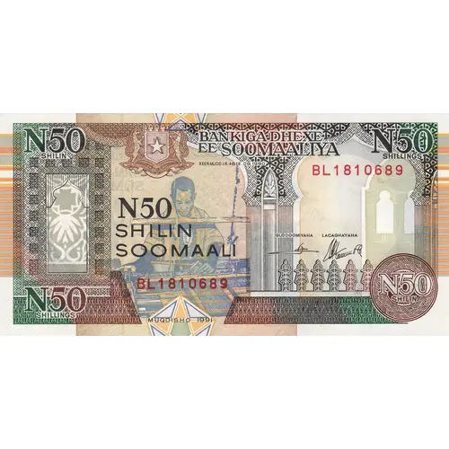 (Translation: Central Bank of Somalia, 50 N[ew] Somali Shillings)