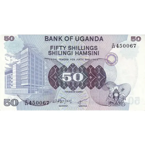 | Legenda del rovescio | BANK OF UGANDA FIFTY SHILLINGS SHILINGI HAMSINI 50 (Translation: Fifty shillings) |
