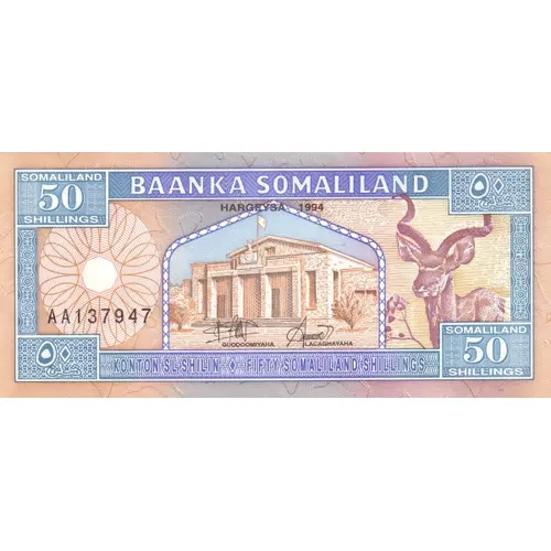 | Rückseitenlegende | BANKAA SOMALILAND FIFTY SOMALILAND SHILLINGS KONTON SL SHILIN SOMALILAND 50 SHILLINGS ٥٠شن (Translation: Bank of Somaliland Fifty Somaliland Shillings.) |