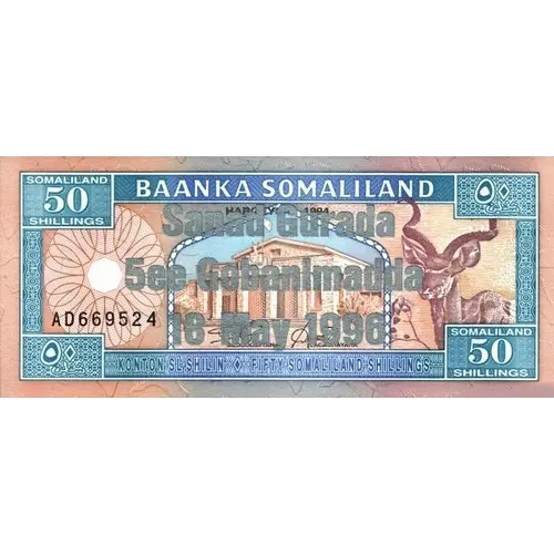 | Opis líce | BANKAA SOMALILAND LABAATAN SL SHILIN SOMALILAND 50 SHILLINGS ٢٠شن Sanad Gurada 5ee Gobanjmadda 18 May 1996 (Translation: Bank of Somaliland Fifty Somaliland Shillings.) |