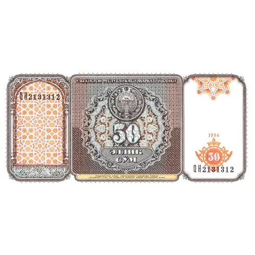 | Obverse lettering | ЎЗБЕКИСТОН РЕСПУБЛИКАСИ МАРКАЗИЙ БАНКИ 50 ЭЛЛИК СЎМ ЎЗБЕКИСТОН СЎМИ РЕСПУБЛИКА ҲУДУДИДА ХАММА ТЎЛОВАР УЧУН ЎЗ ҚИЙМАТИ БЎЙИЧА ҚАБУЛ ҚИЛИНИШИ ШАРТ (Translation: Central Bank of the Republic of Uzbekistan, Fifty So‘m, The Uzbek so‘m must be accepted at face value for all payments in the republic) |