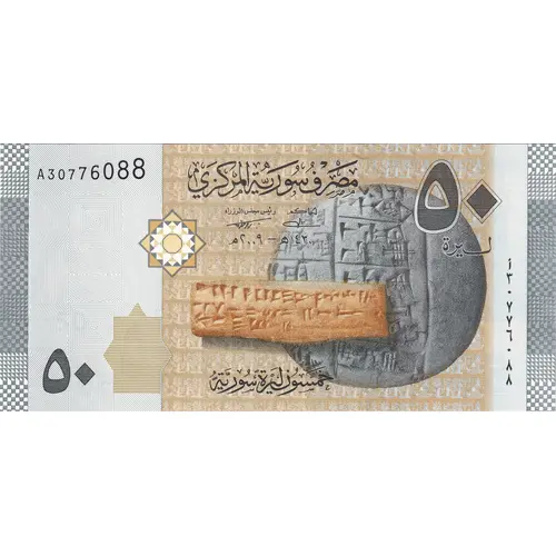 (Translation: CENTRAL BANK OF SYRIA 50 FIFTY SYRIAN POUNDS) |