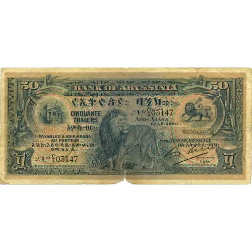 | Legenda del dritto | BANK OF ABYSSINIA የኢትዮጵያ፡ባንክ። CINQUANTE THALERS አምሳ፡ብር። PAYABLES A ADDIS-ABABA AU PORTEUR (Translation: Bank of Ethiopia Fifty Birr) |