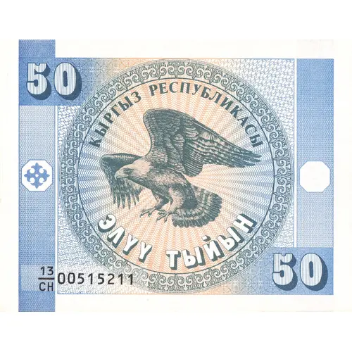 | Opis líce | КЫРГЫЗ РЕСПУБЛИКАСЫ ЭЛҮҮ ТЫЙЫН (Translation: Kyrgyz Republic, Fifty Tıyın) |