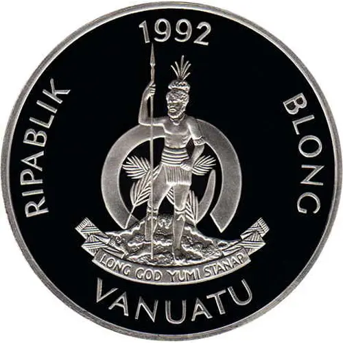 | Legenda awersu | RIPABLIK 1992 BLONG LONG GOD YUMI STANAP VANUATU (Translation: Republic of Vanuatu In God We Stand) |