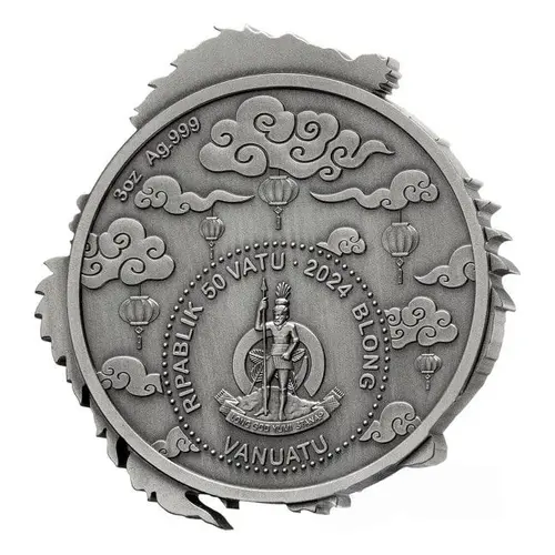 | Legenda awersu | 3oz Ag.999 RIPABLIK 50 VATU · 2024 BLONG LONG GOD YUMI STANAP VANUATU (Translation: Republic of Vanuatu. In God we stand.) |