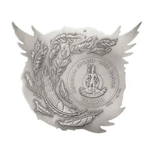 نوشته‌های روی سکه RIPABLIK 50 VATU · 2024 BLONG LONG GOD YUMI STANAP VANUATU 500g · Ag .999